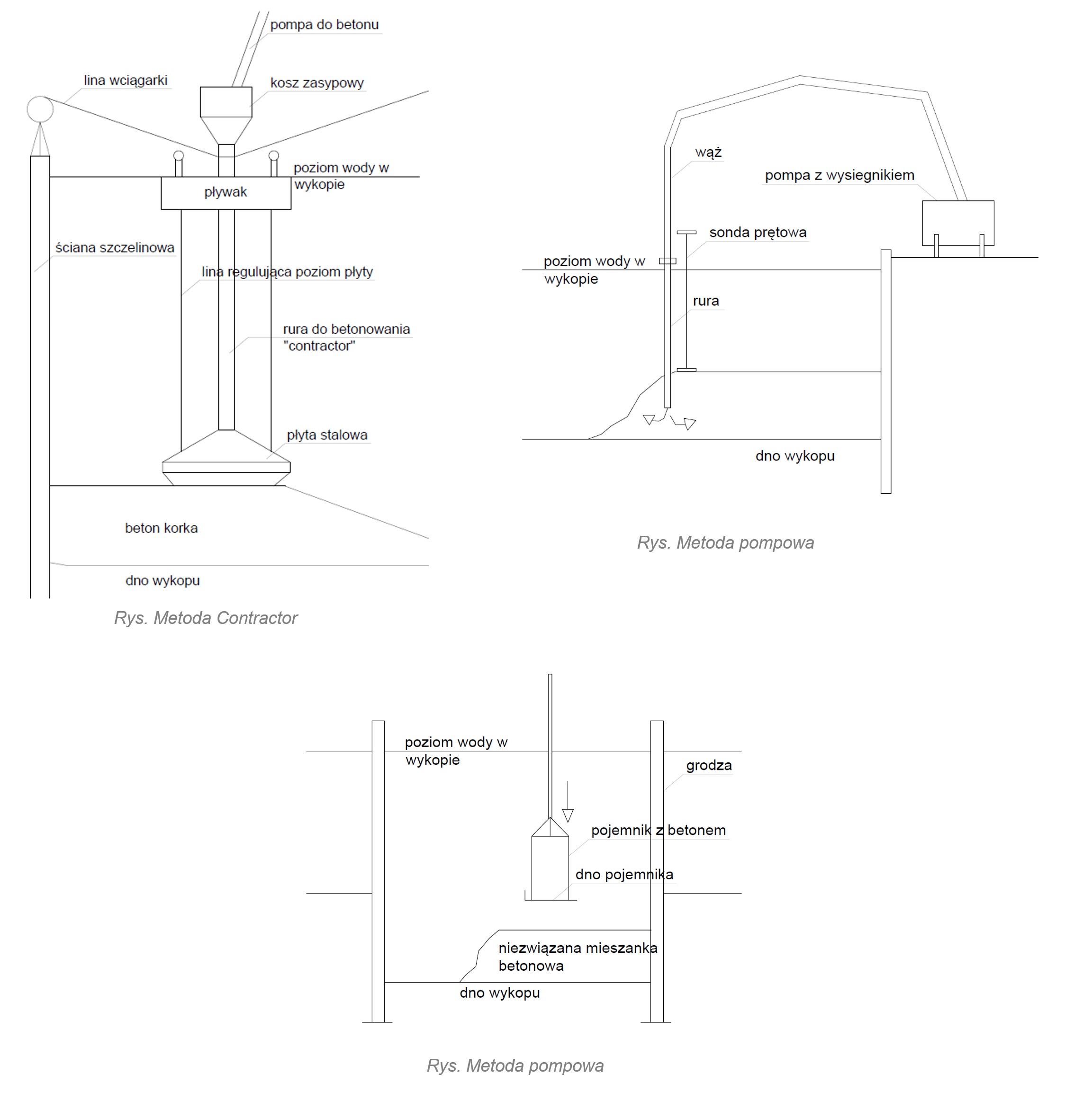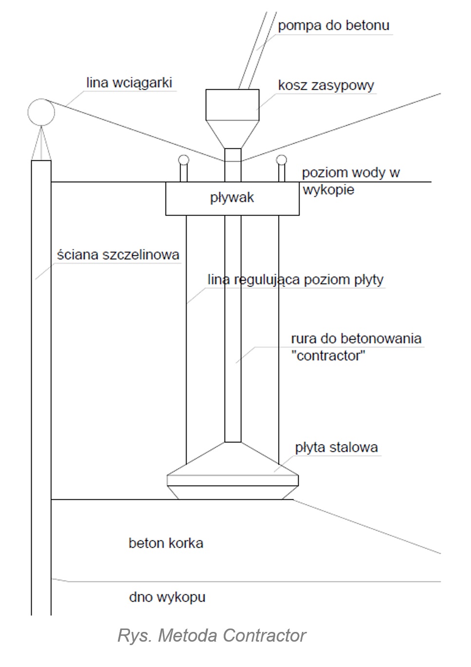 Metoda Contractor jest metodą grawitacyjną. Rura o średnicy 20-30 cm zamykana jest gumową kulą nazywaną też korkiem, która oddziela mieszankę betonową od wody. Po napełnieniu rury betonem korek jest obniżany do momentu wysunięcia się z rury. A następnie wypływa na powierzchnię. Z rury zaczyna wypływać mieszanka betonowa, z której formuje się bryła otaczająca bryłę. Końcówka rury musi być zagłębiona minimum 1 m w betonie, aby zapobiec rozmyciu i segregacji.