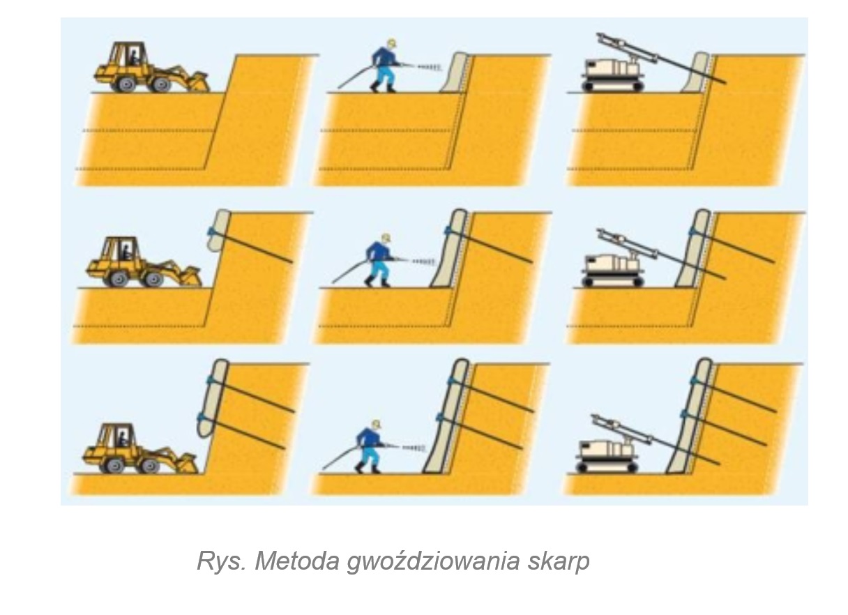 Poprawę tych parametrów uzyskuje się poprzez uzbrojenie gruntu prętami (gwoździami), wytwarza się blok z tworzywa zespolonego - gruntu i elementów zbrojenia, który przy zastosowaniu odpowiedniej ilości gwoździ na 1 m2 skarpy zachowuje się jak konstrukcja masywna.
