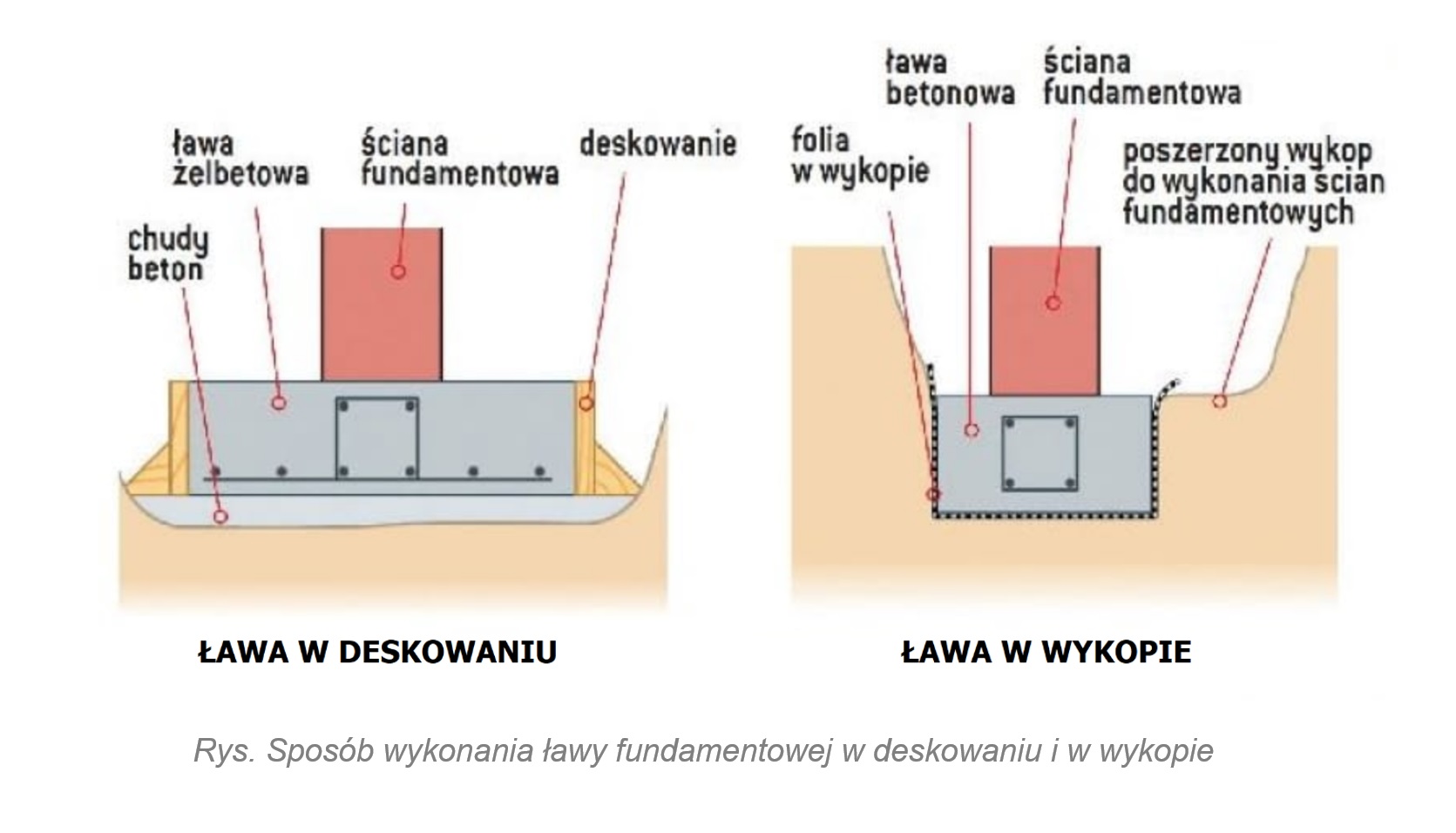 Deskowanie układa się na stwardniałym chudym betonie, następnie montuje zbrojenie i wylewa beton. Jeśli nie zrobi się chudego betonu, to na styku z podłożem gruntowym świeża mieszanka betonowa miesza się z gruntem i w tym ważnym dla trwałości fundamentów miejscu beton będzie porowaty, o bardzo małej wytrzymałości i odporności na zamarzanie. Gdy ława ma być wykonana bezpośrednio w gruncie, wykop robi się na jej wymiar. Następnie jego dno i boki wykłada się folią hydroizolacyjną, która - podobnie jak deskowanie - zapobiega wyciekaniu zaczynu cementowego z mieszanki betonowej. Dzięki temu beton uzyska odpowiednią wytrzymałość.