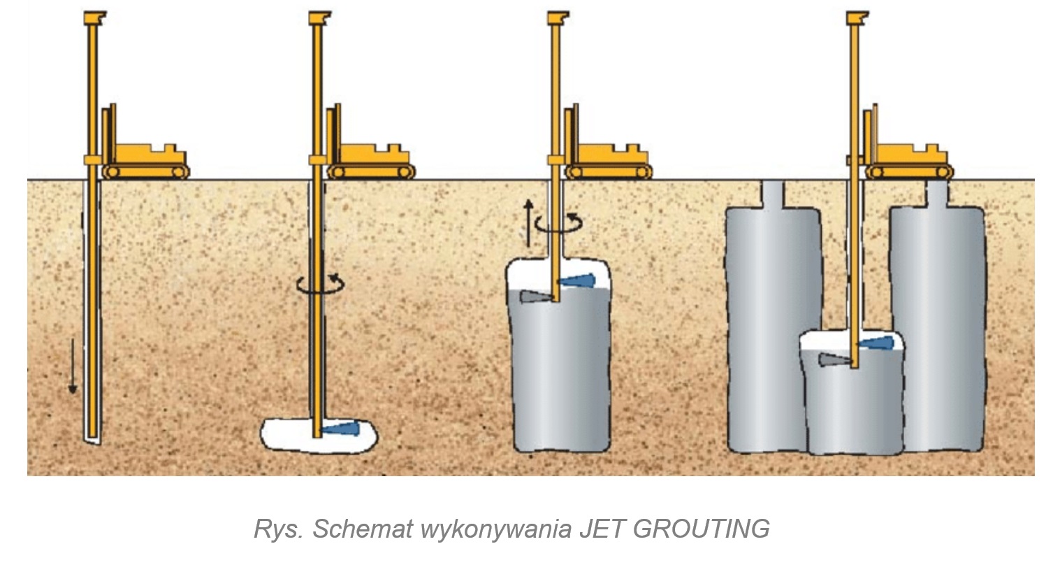 Wykonawstwo technologii iniekcji strumieniowej można przedstawić etapowo. Pierwszy etap rozpoczyna się od wywiercenia otworu za pomocą żerdzi z dyszami iniekcyjnymi, zakończonej koronką wiertniczą. Po osiągnięciu w gruncie projektowanej rzędnej podstawy konstruowanego elementu następuje druga część realizacji, a więc podnosi się żerdź, która jednocześnie obraca się i podaje zaczyn pod ciśnieniem rzędu 30-50 MPa, z wydatkiem 50-450 l/min. Po zmieszaniu gruntu ze spoiwem zachodzi wiązanie, tworząc gruntowo-cementową strukturę uformowanej bryły iniekcyjnej.