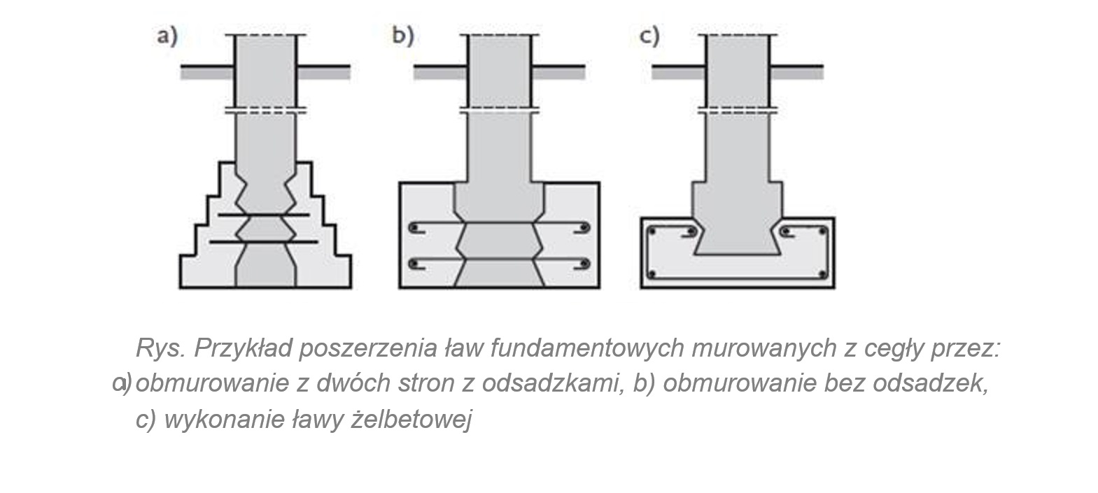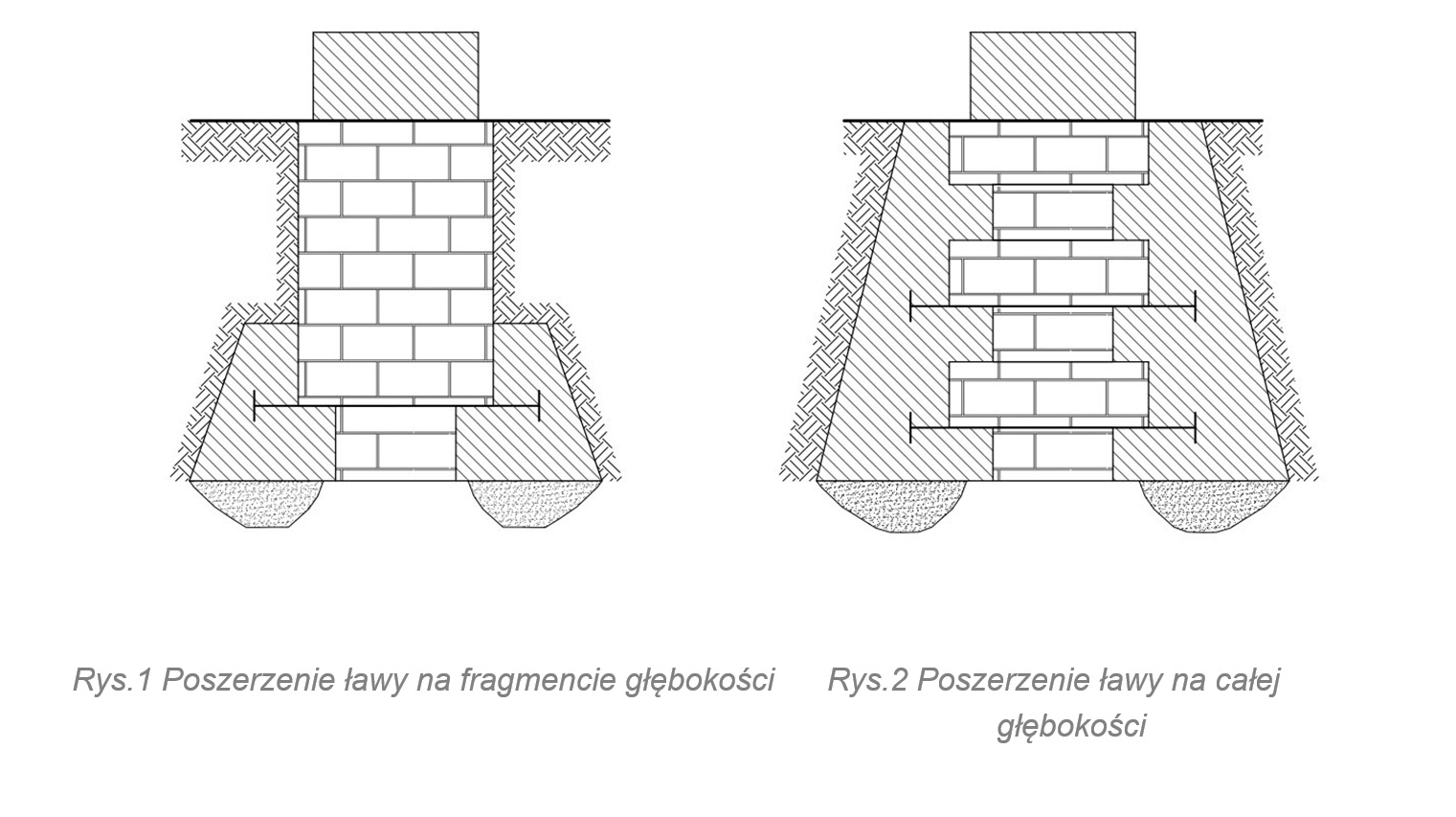 Poszerzenie ławy polega m.in. na powiększeniu szerokości podstawy fundamentu. W zależności od rodzaju ławy murowanej poszerzenie wykonuje się na całej głębokości aż do powierzchni gruntu (rys. 2), bądź tylko na fragmencie (rys.1).