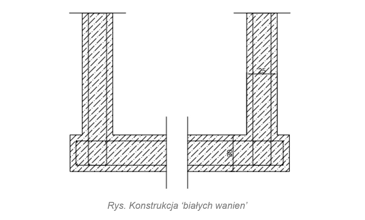 Biała wanna wykonywana jest jako konstrukcja żelbetowa, monolityczna, posiadająca płytę denną i ściany, będące jednocześnie ścianami fundamentowymi. Rozwiązanie to stosuje się jako hydroizolację bezpowłokową w kondygnacjach podziemnych, kiedy wymagają tego warunki gruntowe - jest to rozwiązanie dość drogie i problematyczne na etapie wykonawstwa. Do wykonania "białych wanien" wykorzystywany jest beton wodoszczelny o klasie co najmniej W8, który pełni funkcję hydroizolacji. Samą konstrukcję wykonuje się w ścisłym reżimie technologicznym. Wymaga to sporządzenia dokładnego projektu i przestrzegania wytycznych na etapie wykonawczym, w tym dotyczących np. receptury betonu czy kontroli zarysowań betonu. Te ostatnie dotyczą etapowania wylewania betonu, tzw. dzielenia na takty.