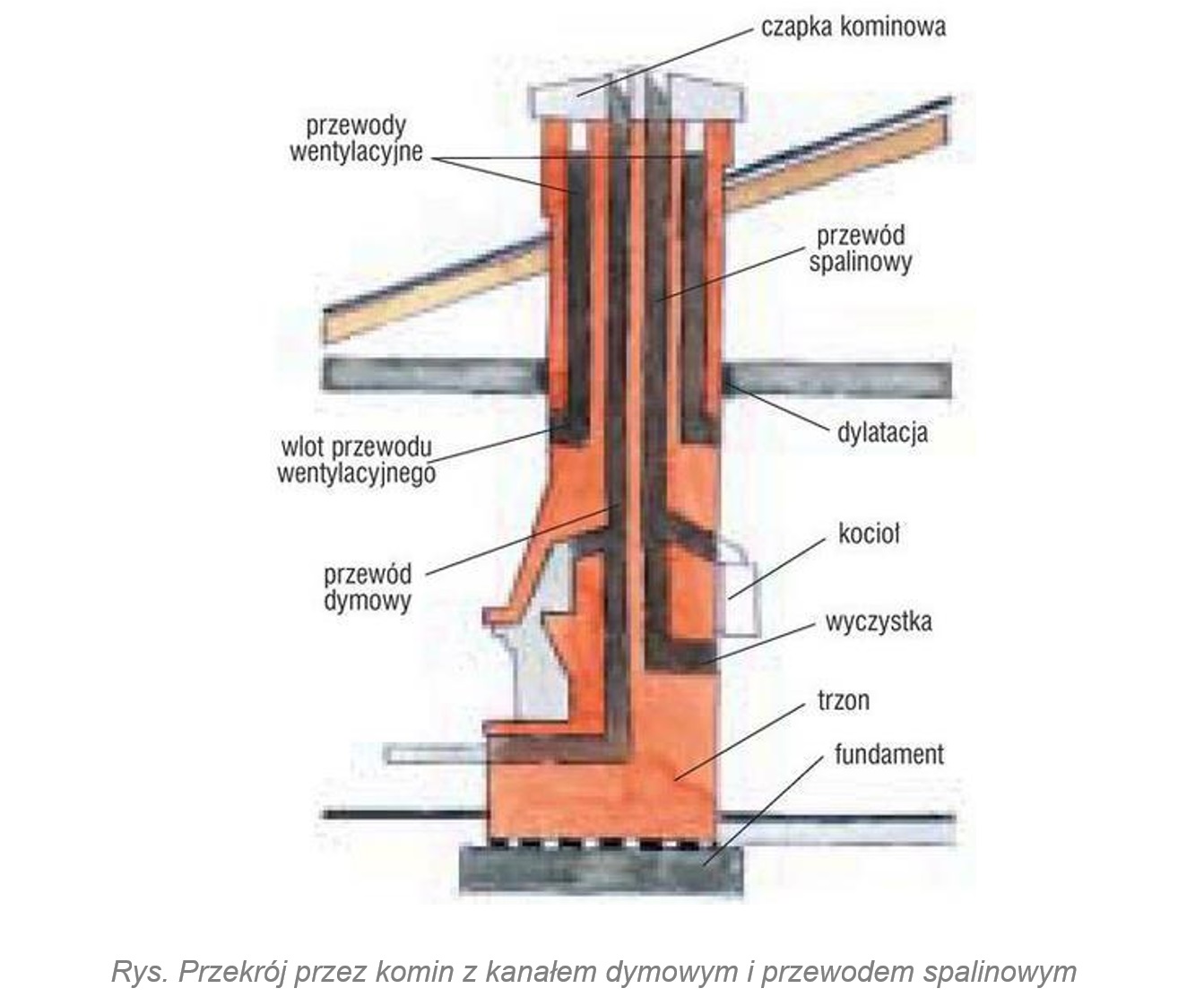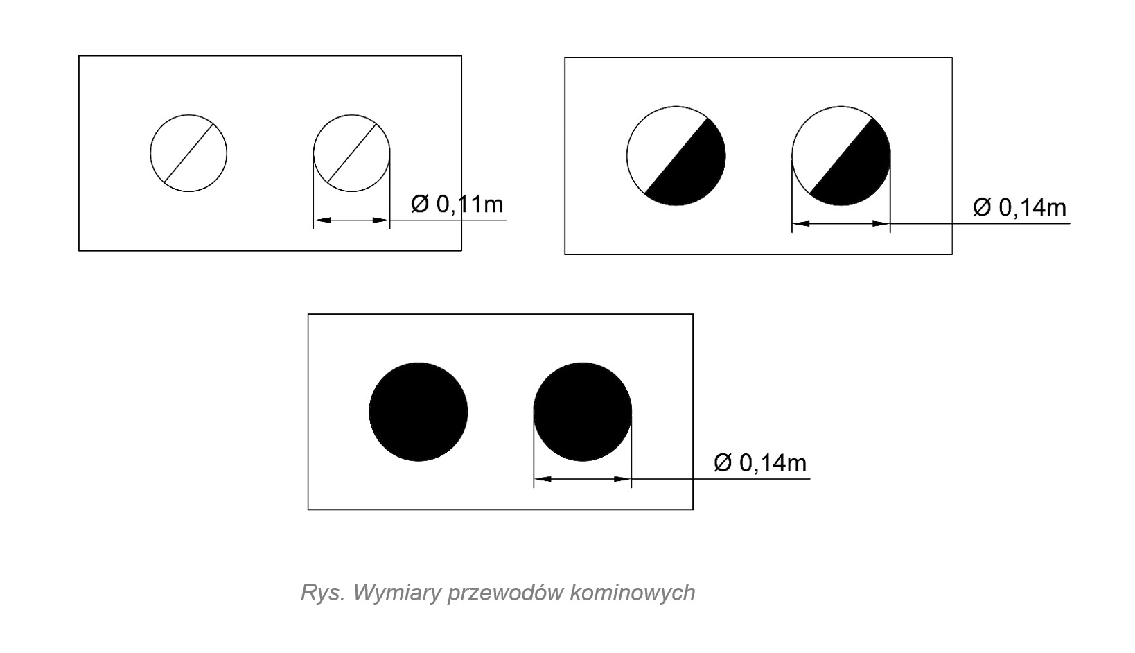 Przewody kominowe spalinowe o ciągu naturalnym i przewody dymowe, prowadzone w ścianach budynku, tworzące osobną konstrukcję lub połączone trwale z konstrukcją powinny spełniać wymagania określone w Polskich Normach i posiadać wymiary przekroju lub średnicę co najmniej 0,14 m.