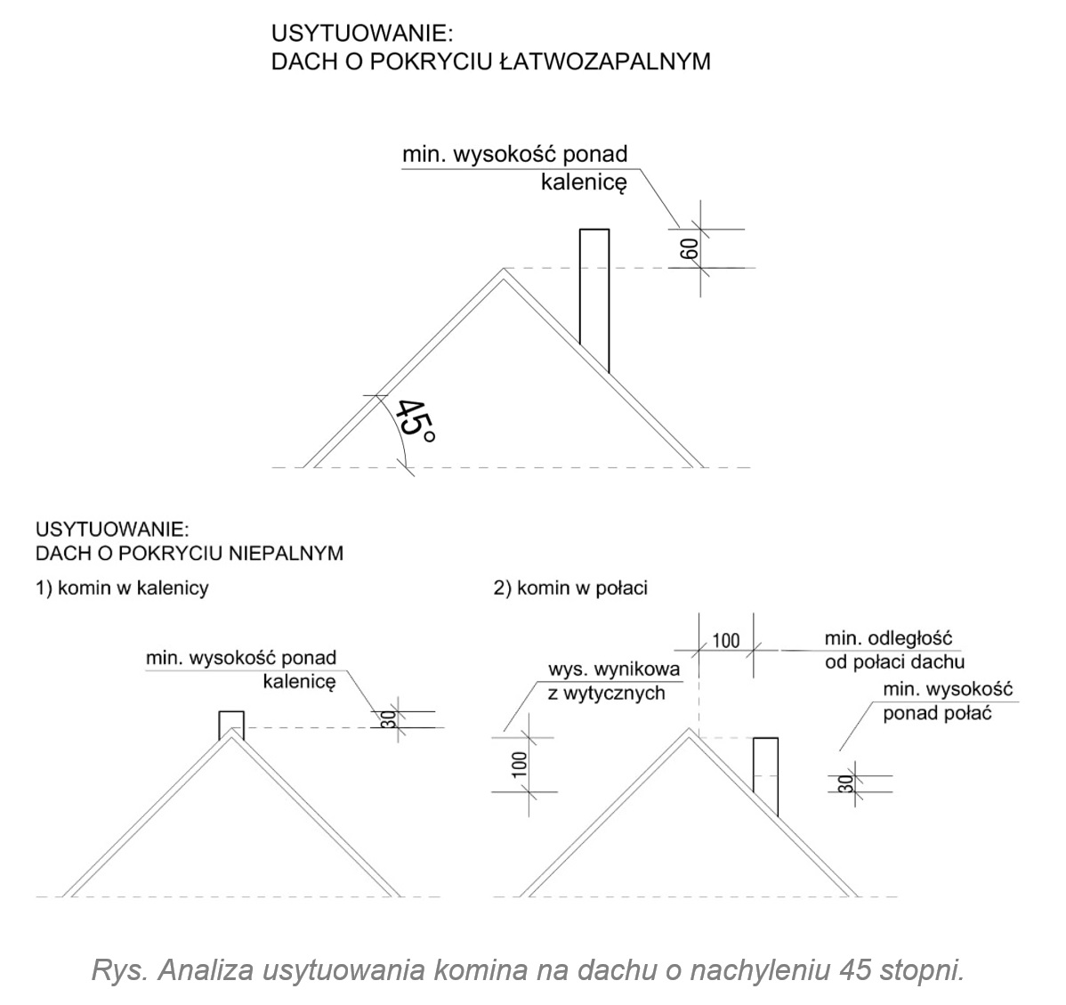 Omówić, w jakich odległościach należy wykonać komin w dachu o nachyleniu 45 stopni?