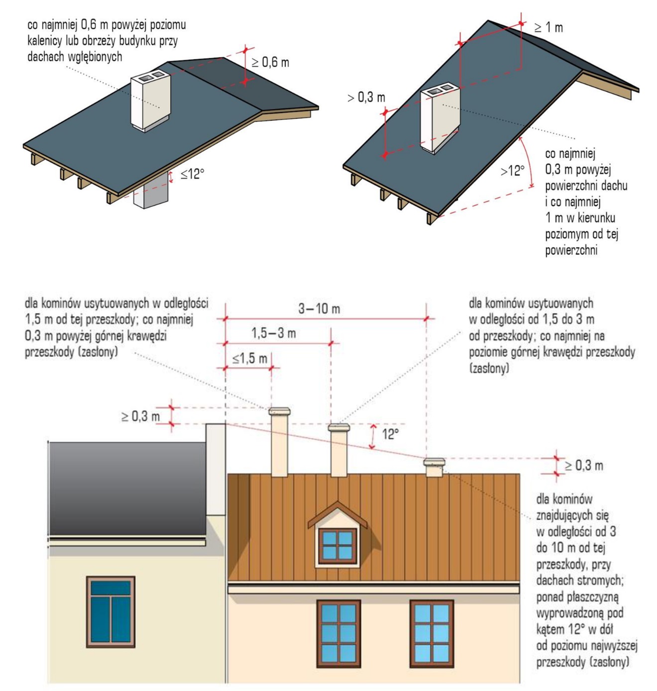 Za minimalną odległość wierzchołka komina od poziomu połaci dachowej przyjmuje się 30 cm. Jest to odległość przyjmowana w przypadku do pokryć dachowych niepalnych lub trudno zapalnych. Dla pokryć łatwo zapalnych, minimalna odległość wylotu komina od połaci dachowej powinna wynosić min. 60 cm przy zachowaniu poziomej odległości od połaci dachowej równej 100 cm.