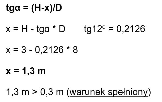 Jeżeli odległość wyniesie 8 m, wówczas wysokość minimalną komina należy obliczyć z zachowaniem kąta pomiędzy górną krawędzią czapy kominowej, a górną krawędzią stropu ściany 12 stopni, lecz przyjmować wysokość nie mniejszą niż 0,3 m.