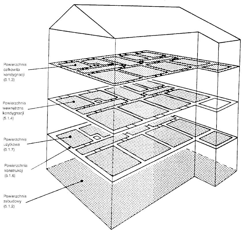 Do powierzchni użytkowej budynku wlicza się metraż pomieszczeń w budynku, takich jak: pokoje, sypialnie, kuchnie, łazienki i pomieszczenia gospodarcze. Zgodnie z rozporządzeniem PN-ISO 9836:1997 w skład powierzchni użytkowej nie zalicza się garażu, strychu, kotłowni, korytarzy czy klatek schodowych. Według normy wszystkie pomieszczenia o wysokości niższej niż 1,4 m nie powinno wliczać się w powierzchnię użytkową. Oddzielnie oznacza się powierzchnię balkonów i tarasów, które nie zostały zabudowane. Niezabudowane balkony i tarasy nie wliczają się, ale już te ze ściankami lub zadaszeniem są częścią powierzchni użytkowej domu.