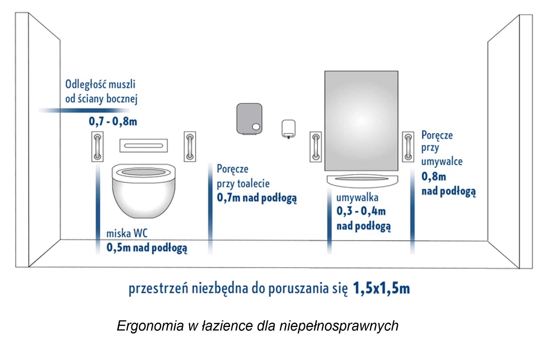 Według przepisów minimalne wymiary potrzebne do samodzielnego poruszania się na wózku inwalidzkim to 1,5 × 1,5 m. Kwadrat wytyczający taką przestrzeń umożliwia swobodne korzystanie z sanitariatów. Ważne jest również to, aby zwrócić uwagę na inne detale - np. wysuwane szafki, które mogłyby ograniczyć przestrzeń do poruszania się.